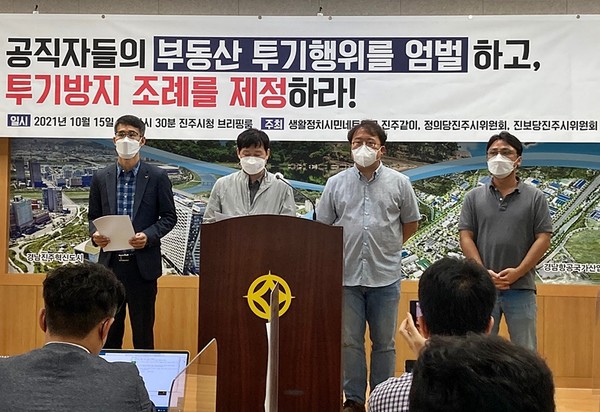 생활정치시민네트워크 진주같이와 정의당 진주시위원회, 진보당 진주시위원회 등은 15일 진주시청 브리핑룸에서 기자회견을 열어 “진주시 주도의 개발사업의 필지 거래내역과 진주시 전·현직 공직자 명단을 무작위 대조하는 방식으로 공동 조사를 진행한 결과, 불법투기 의심 사례가 확인됐다”며 이같이 말했다.