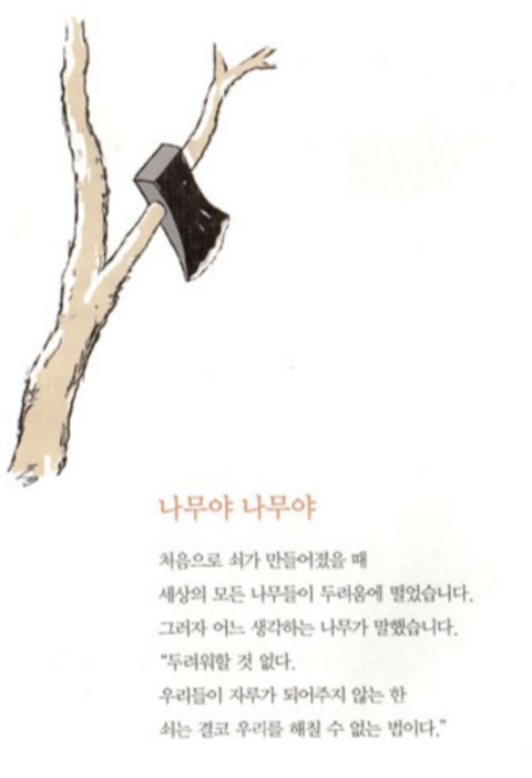 “처음 쇠가 만들어졌을 때 나무들은 두려움에 떨었다. 그러나 어느 생각 깊은 나무가 말했다. 우리들이 자루가 되어주지 않는 한 쇠는 결코 우리를 해칠 수 없다.”