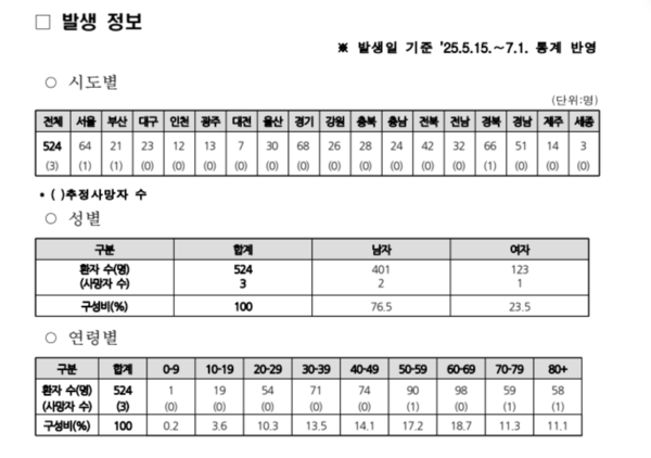 같은 기간 온열질환 추정 사망자는 3명으로 지난해보다 1명 늘었다. 연령대별로는 60대 이상 고령층의 비중이 높았으며, 발생 장소의 84.9%가 논밭, 길가, 작업장 등 실외 공간이었다.