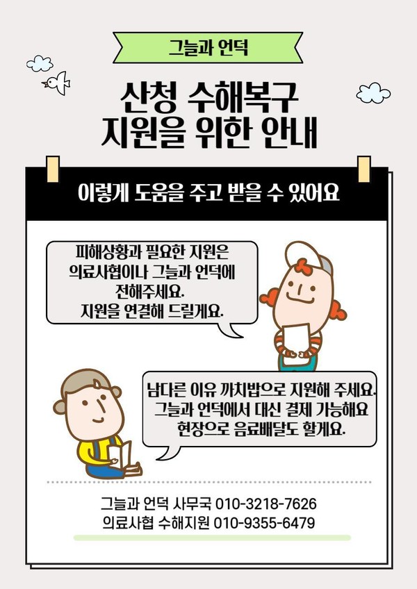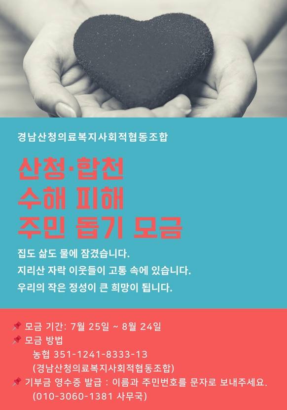 -수해복구 돕기 성금 계좌농협 351-1241-8333-13 (예금주: 경남산청의료복지사회적협동조합)