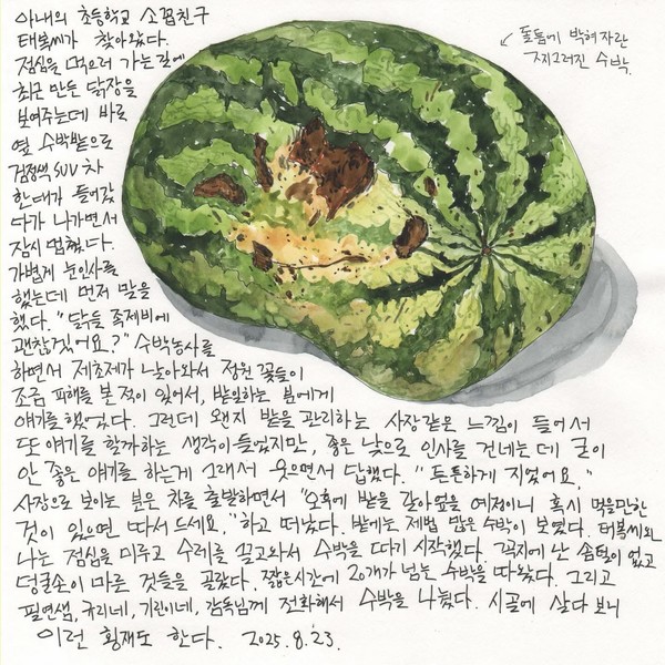 밭에는 제법 많은 수박이 보였다. 태복 씨와 나는 점심을 미루고 수제를 끌고 와서 수박을 따기 시작했다. 꼭지에 난 솜털이 없고 덩쿨손이 마른 것들을 골랐다. 짧은 시간에 20개가 넘는 수박을 따왔다. 그리고 필연샘, 규리네, 기린이네, 감독님께 전화해서 수박을 나눴다. 시골에 살다 보니 이런 횡재도 한다.