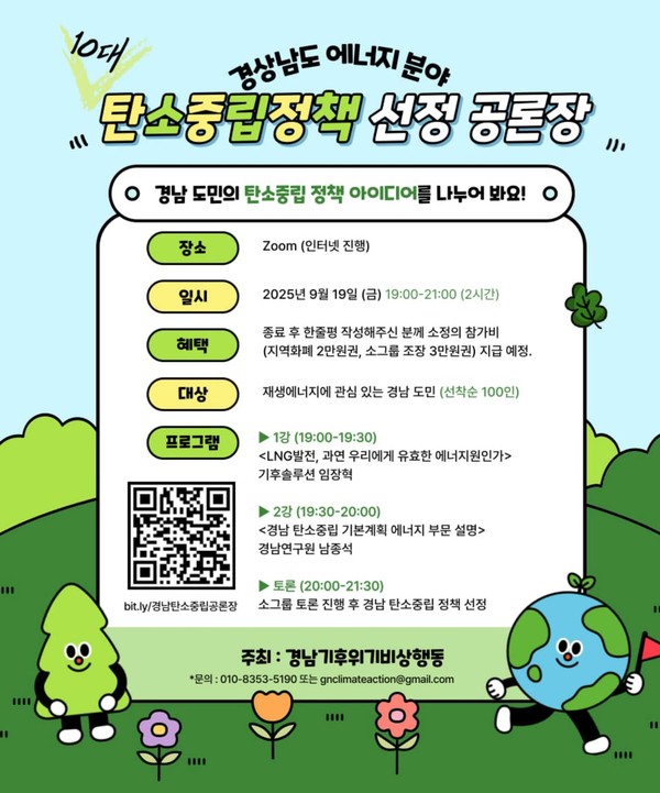 참가는 온라인 신청 링크(bit.ly/경남탄소중립공론장)를 통해 가능하며, 문의는 전화(010-8353-5190) 또는 이메일(gnclimateaction@gmail.com)로 하면 된다.