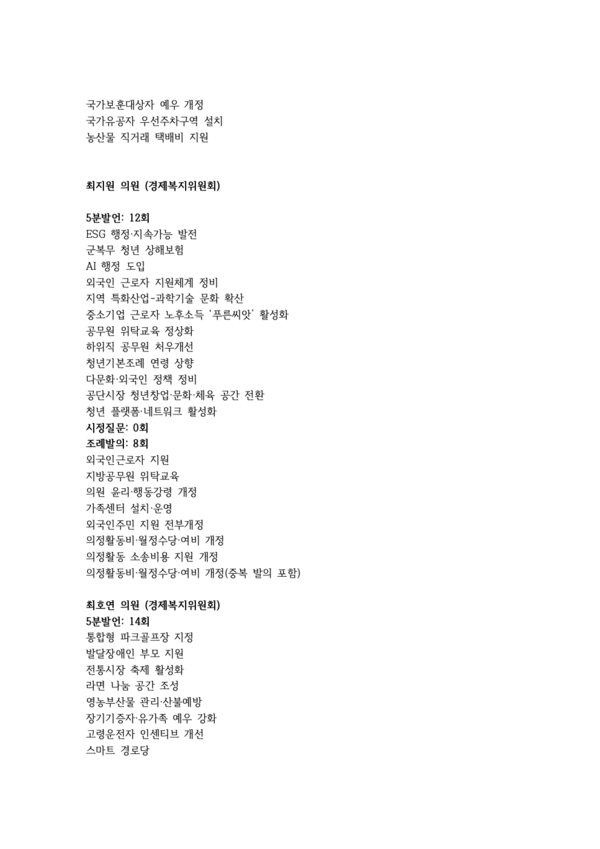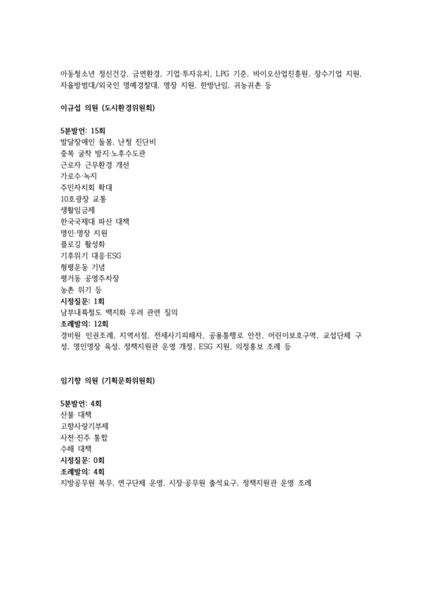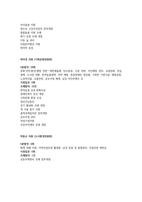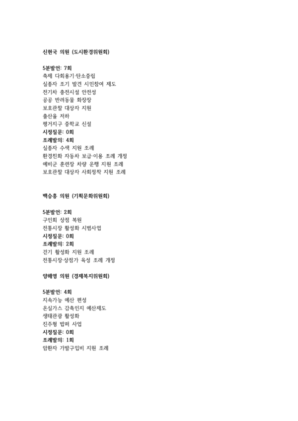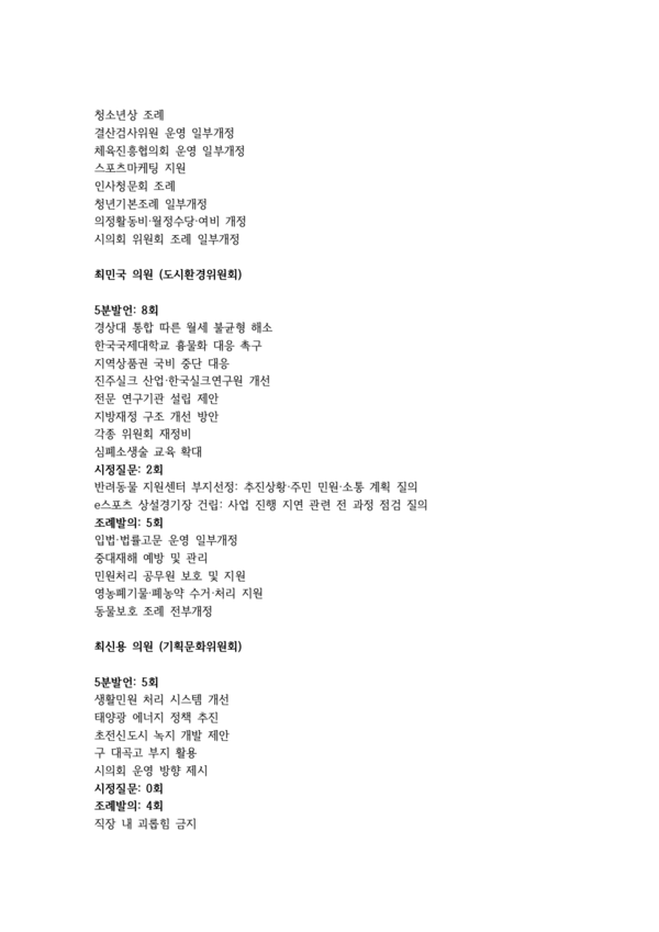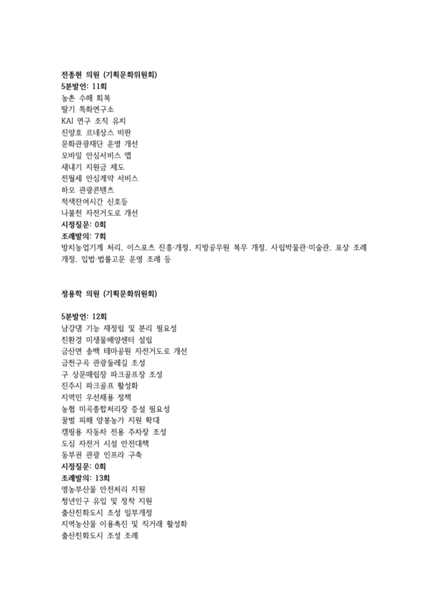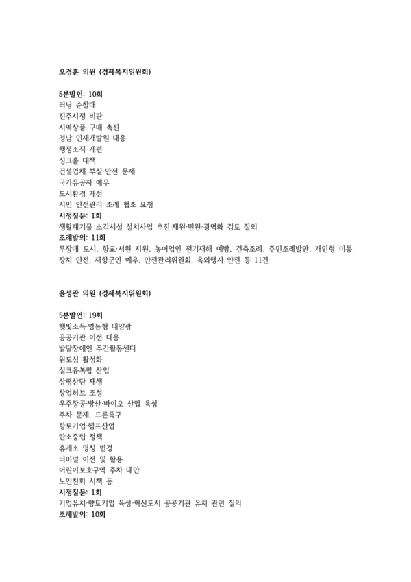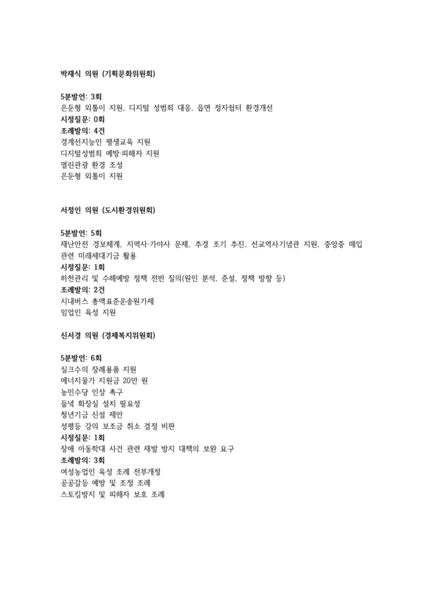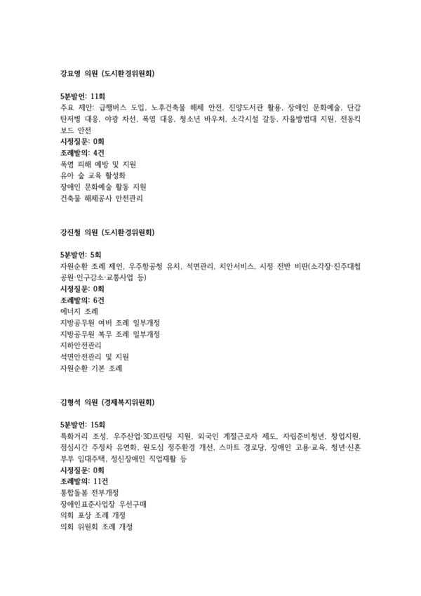 2022년 7월 1일- 2025년 10월 30일 기준 진주시의회 홈페이지 의정활동 분석 첨부파일 : 9대시의원_자료정리.hwp (진주시의회 9대시의원_5분발언 등 자료정리) 키워드 #진주시의회 #9대시의회분석 단디뉴스 dandinews@hanmail.net 다른기사 보기 저작권자 © 단디뉴스 무단전재 및 재배포 금지 당신만 안 본 뉴스 진주 상봉동 원룸서 새벽 화재..직장 동료 2명 숨져 배달 한 건에 2600원..“목숨 걸고 달린다” “지리산이 그리운 모든 이들에게”..연규현 한국화가 〈지리산 일기〉 전시 초대 진보당, “예산 낭비·불법 행정 고발 예고..진주시장 책임” 촉구 [김현옥 칼럼]내가 이주민의 삶을 기록하는 이유 3년 넘도록 시정질문 단 7건..9대 진주시의원, 얼마나 일했나 [눈에띄는 새 책] 38년 동안의 치열한 기록…『교육, 그 빛나는 이름』 출간 진주 상봉동 원룸서 새벽 화재..직장 동료 2명 숨져 주요기사 9대 진주시의회 국외 연수 2억 2백 여 만원 사용..행안부, 지방의회 국외연수 ‘제동’ “아이들의 위기, 힘 모아 함께 풀고 희망 그린다” 진주시 ‘재능러’ 청소년에게 국제 무대 경험 기회 ‘활짝’ 박종규 진주시의원 발의 도시재생사업 사후관리 조례안, 시의회 상임위 통과 교통약자의 발, 전동보조기기 사고 대비 ‘보험 안전망’ 구축 추진 윤성관 진주시의원, 창업기획자·벤처투자 육성 조례 도내 첫선