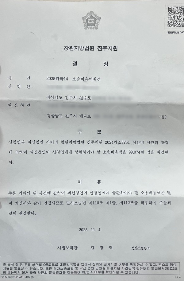 창원지방법원 진주지원은 지난 11월 4일, 시안비 청구 사건(2024가소3251)에 대해 민사소송법 제110조 1항, 제112조를 근거로 B씨가 A씨에게 소송비용 99,074원을 상환해야 한다고 결정했으며, 앞서 법원은 시안 디자인 제작비 6만원 지급을 명령했다.