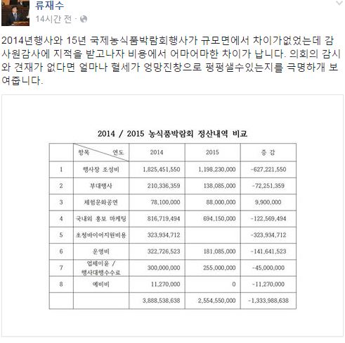 류 의원은 게시글에서 “2014년 행사와 2015년 국제농식품박람회 행사가 규모면에서 차이가 없었다”면서 “감사원 감사에서 지적을 받고나자 비용에서 어마어마한 차이가 난다”고 밝혔다.