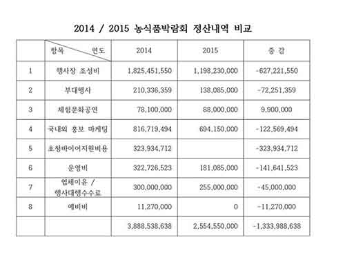 실제 류 의원이 공개한 정산 내역서 비교표에 따르면 2015년에는 농식품박람회 전체 결산에서 총 13억 3400만 원 정도가 줄었고, 항목에서 행사장 조성비가 2014년에 비해 6억 2700만 원이 팍 줄었다.