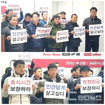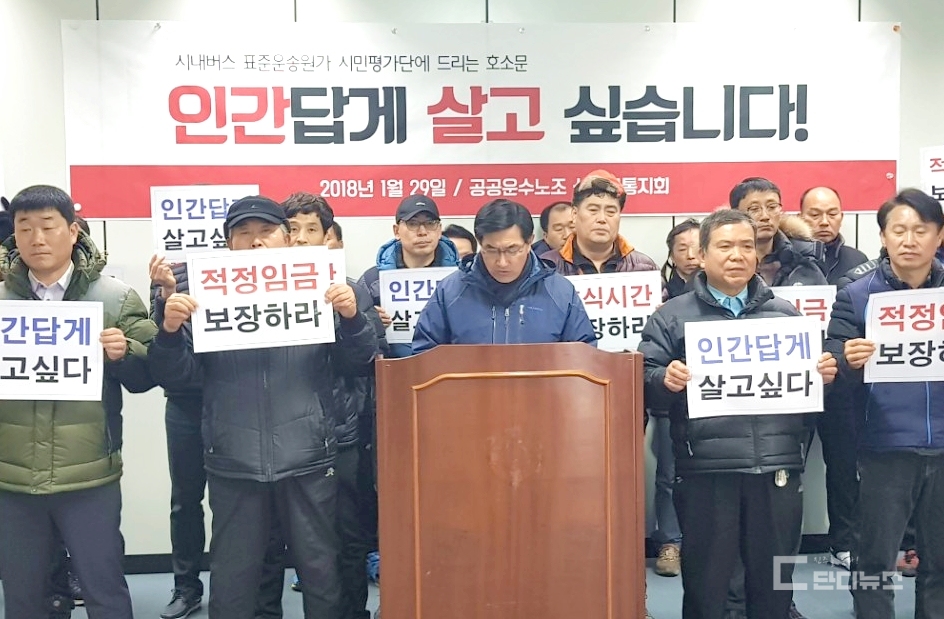 전국공공운수노동조합 삼성교통지회가 29일 진주시청 브리핑룸에서 기자회견을 열고 “인간답게 살고 싶다”며 적정수준의 표준운송원가 책정을 진주시에 요구했다.